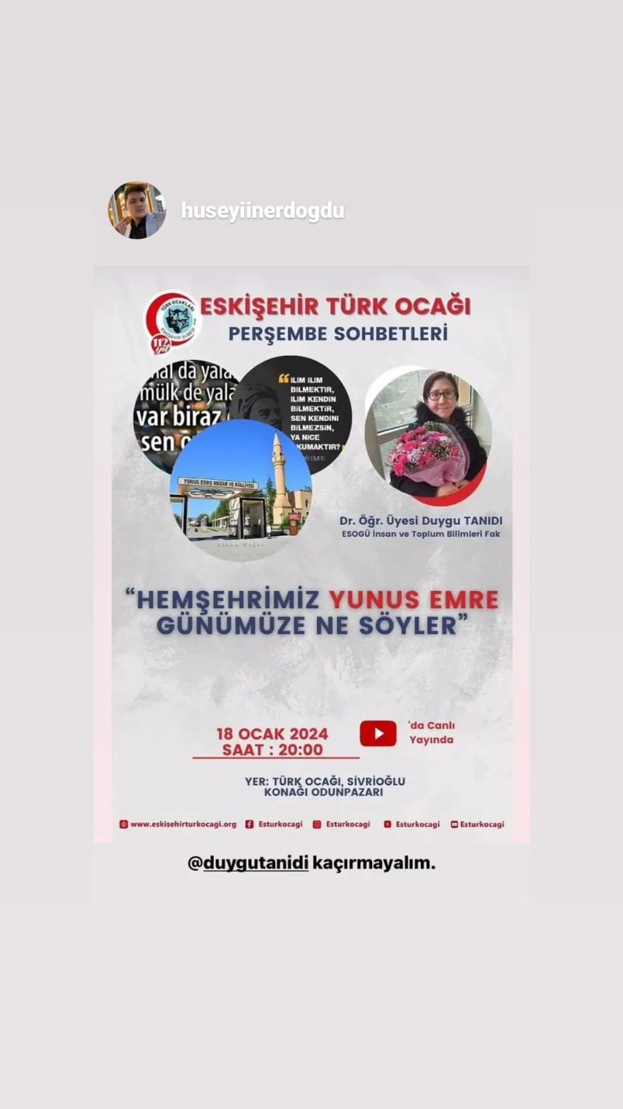 Bölümümüz öğretim üyelerinden Dr. Öğr. Üyesi Duygu Tanıdı tarafından Eskişehir Türk Ocağı'nda "Hemşehrimiz Yunus Emre Günümüze Ne Söyler?" başlıklı konferans gerçekleştirilmiştir.