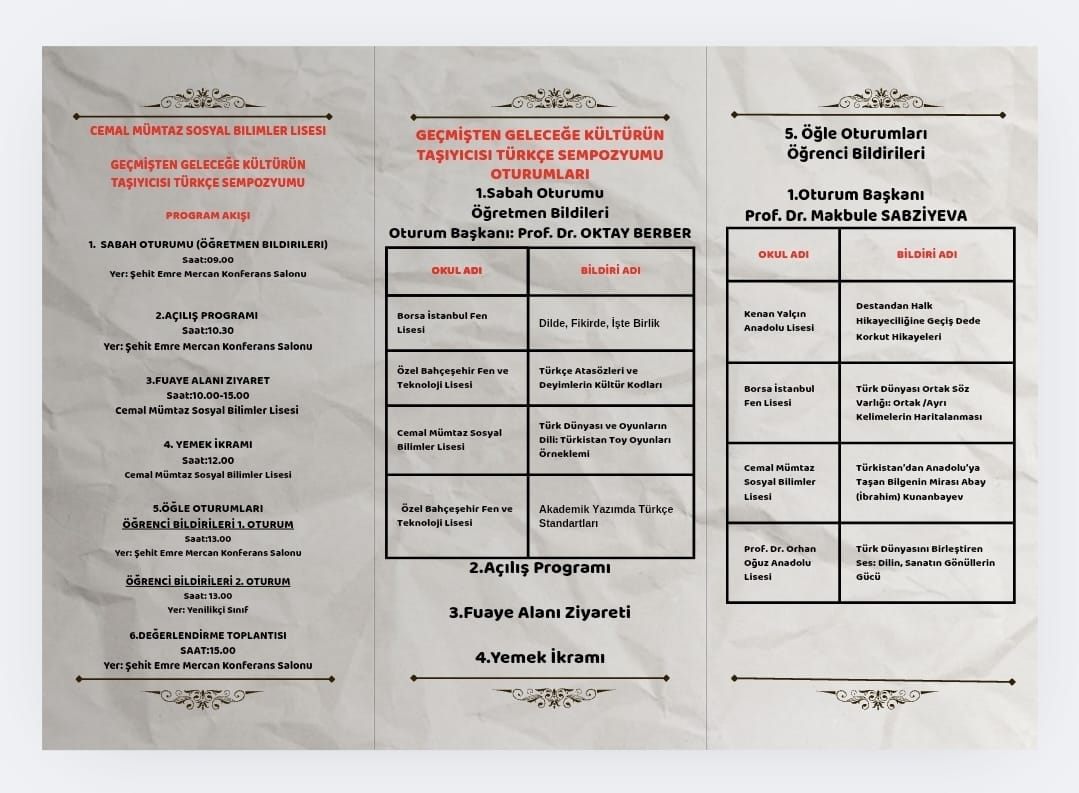 Bölümümüz öğretim üyelerinden Prof. Dr. Oktay Berber, 15 Aralık 2025 tarihinde Cemal Mümtaz Sosyal Bilimler Lisesi'nin düzenlediği "Geçmişten Günümüze Kültürün Taşıyıcısı Türkçe Sempozyumu" etkinliğinde oturum başkanı olarak yer almıştır.
